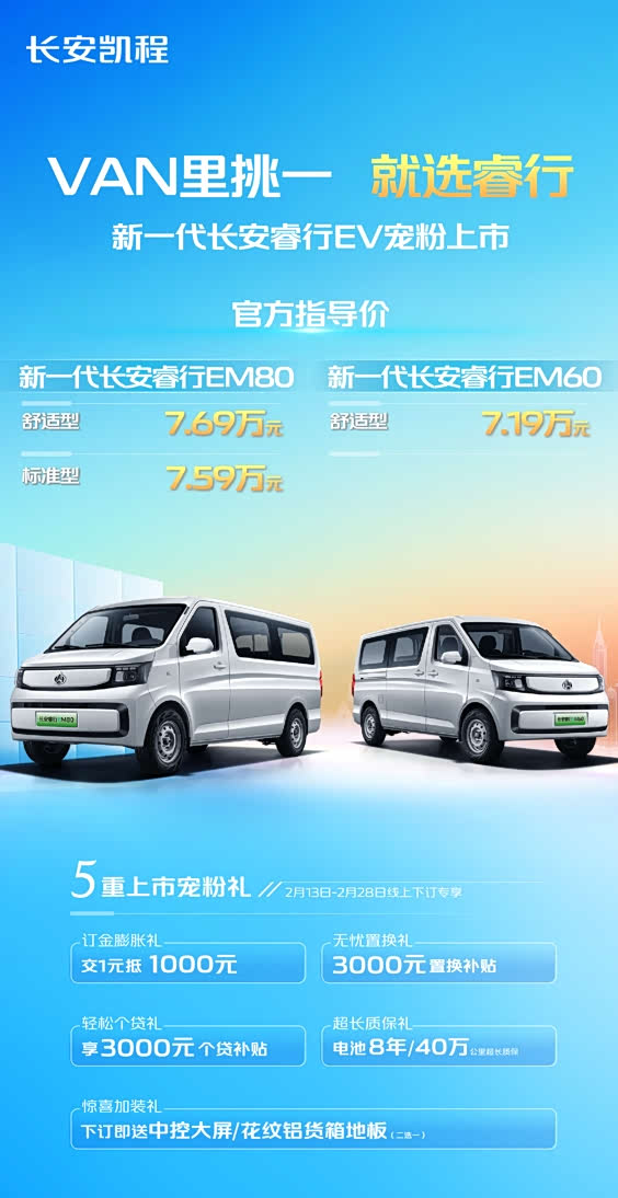 【能拉货也能载人,新长安睿行EV上市】日前新一代长安睿行EV正式上市,其中长安睿行EM60售价7.19万元起,新一代长安睿行EM80售价7.59万元起,搭载宁德时代电池,配备长安全新三合一集成“天工电驱”,最高车速提升至100km/h,300km超长续航,支持30分钟30%-80%快充。作为一款新能源箱货,其对有城市短途运输需求的消费者而言还是很有吸引力的。