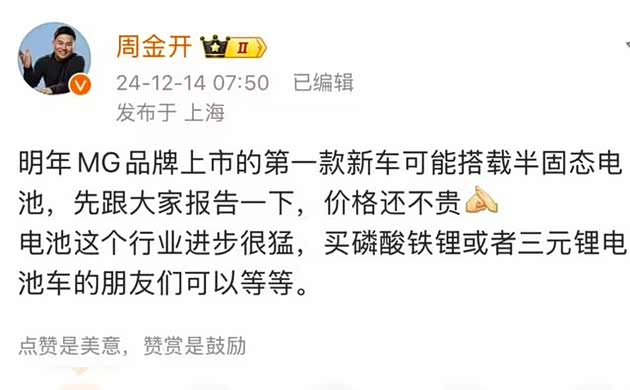 去年名爵品牌事业部总经理周钘就已经公开透露,称名爵在今年上市的首款新车可能搭载半固态电池,将全系标配半固态电池,而且价格还不贵。据相关消息,这款全新车型或定位于旗舰级轿车,但具体信息官方尚未透露,名爵能否靠这款车名声大噪就让我们拭目以待。