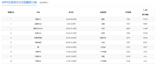 2025年2月入门级MPV和面包车的零售销量(公开资料)为: