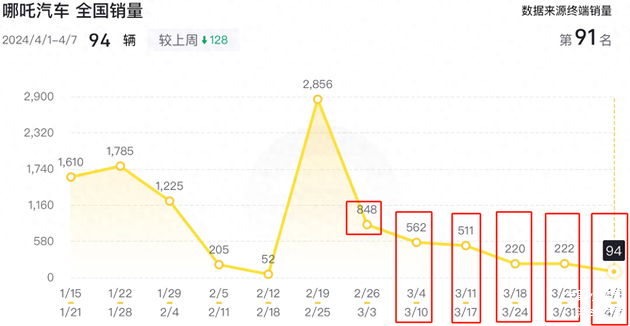 接着就是销量持续走低,当时我发现哪吒汽车2024年3月份每周的上险量只有几百台,但每次公布月销量是都是八九千台时,唯一的解释就是销量数据出现了问题,而问题大概率是出现在车企身上。