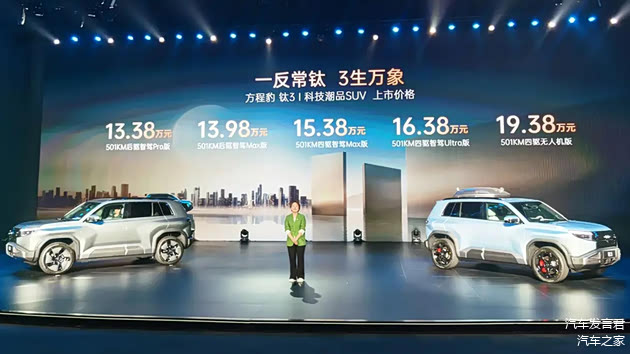 主编意见:方程豹 钛3正式上市了,价格13.38万起。但最值得推荐的车款,玩车趣-车频道编辑一致觉得是加两万的四驱智驾MAX版。虽然多了2万,但有了四驱和可调悬架,蠕行,坦克掉头等特性。关键的是,续航里程和智能辅助配套一点儿没缩水,双电机马力翻倍…就说这2万块加的值不值吧!至于无人机啊,车载冰箱啊这些锦上添花的配置,愿意为此多花4万块的消费肯定也有,但肯定不会考虑太多性价比元素了。但如果将性价比放在首位来考量,还就是四驱智驾MAX版最值。