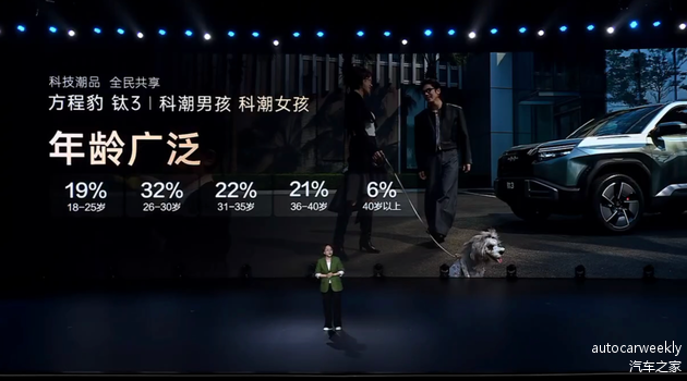 甚至它都不是一辆专门为年轻人造的车,方程豹官方公布的预订用户数据中,最小的18岁,最年长的超过60岁,从十几岁到三十几岁的年龄段占比都差不多,男女占比也接近1比1。