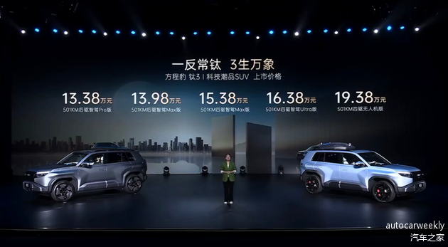 13.38—19.38万元的正式售价,和预售相比入门版降了6000,其余版本各降1万,用方程豹汽车总经理熊甜波的话说,“给的了、给不了的通通给到位了,毫无保留。”
