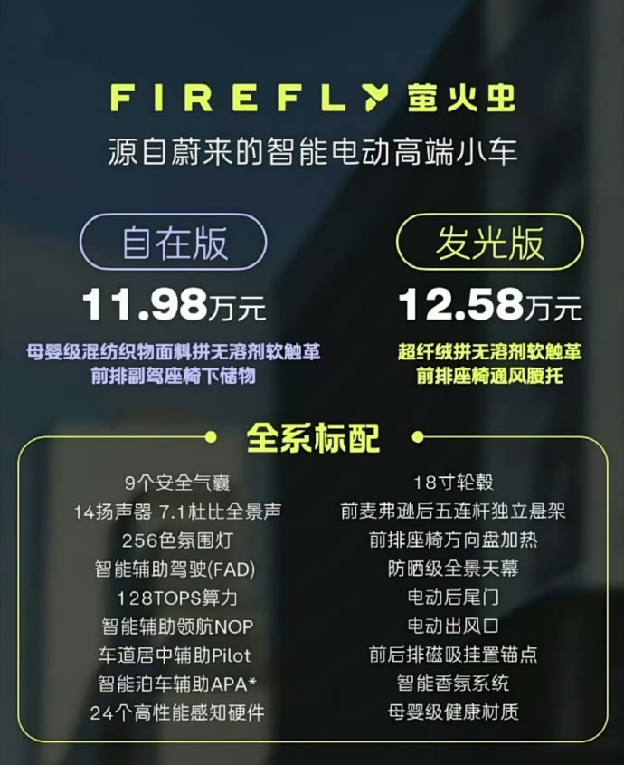 那么蔚来萤火虫选择了后者,11.98万的价格肯定不便宜,但是安全!中欧双5星! 销量上肯定打不过更便宜的,但我希望它能在海外市场 大红大紫!