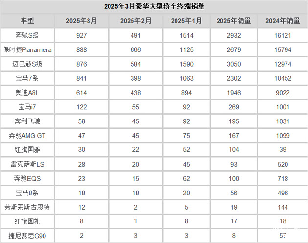 保时捷Panamera的3月终端销量为888辆,前3个月总销量2679辆,相比巅峰时期下滑明显,它是一款定位偏向私人用途的车型,与奔驰S级的目标客户群有明显不同。奥迪A8L的3月终端销量614辆,前3个月总销量1946辆,它的主要卖点是性价比高。宾利飞驰3月终端销量58辆,前3个月总销量195辆,市场存在感比较低,在价格相当的情况下,它甚至不如迈巴赫S级更受欢迎。