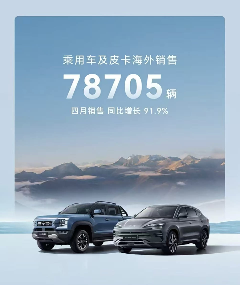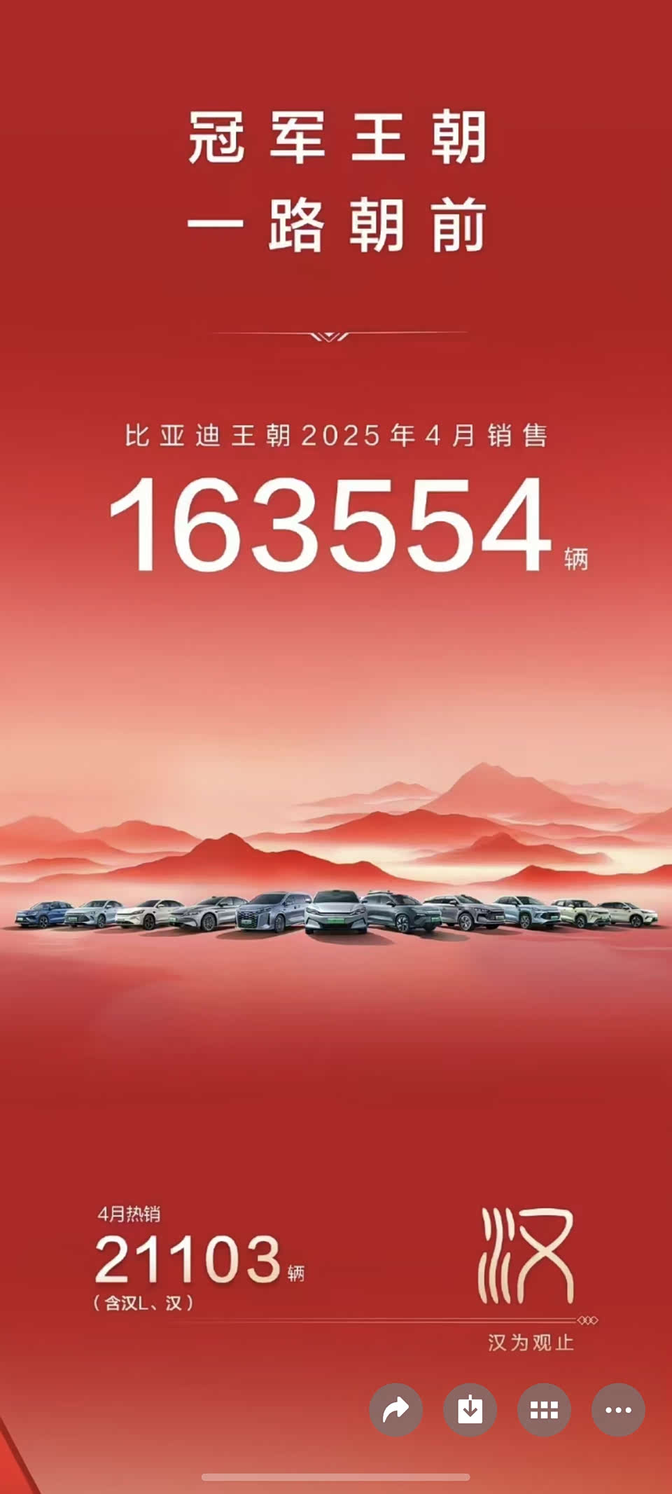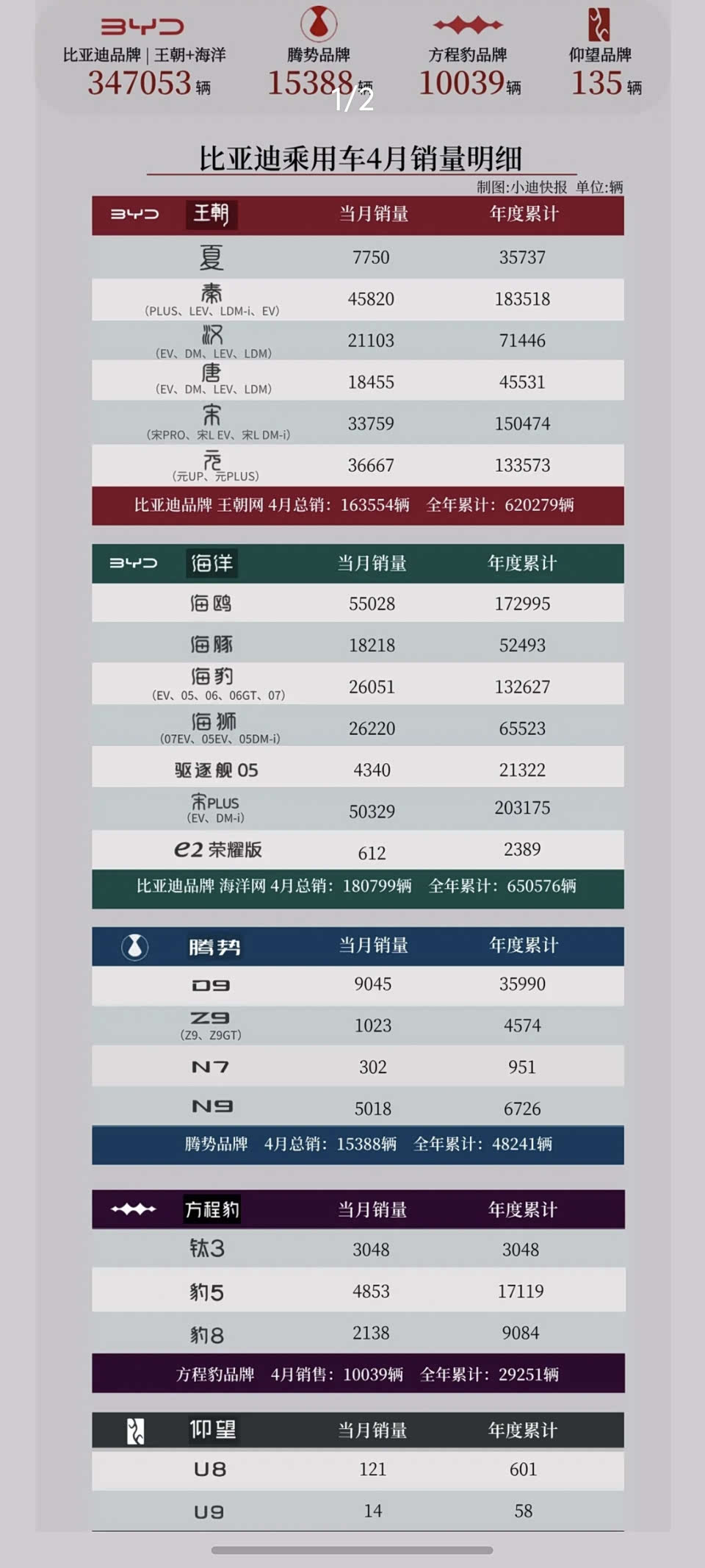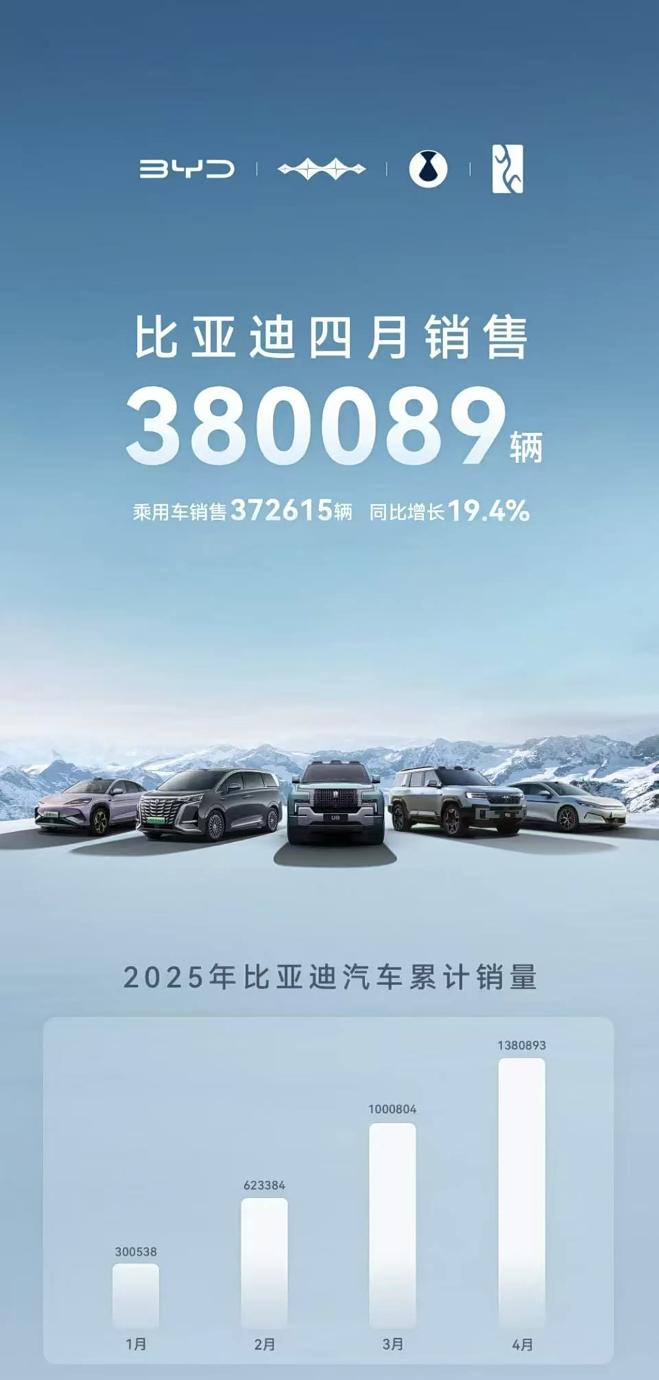 比亚迪在2025年4月的汽车销量达到了380089辆,同比增长21.3%。乘用车销量372615辆。 比亚迪汽车(王朝+海洋)销售了347053辆,同比增长16.5%。 方程豹汽车销售了10039辆,同比增长高达375.8%。 腾势汽车:销售了15388辆,同比增长38.4%。 仰望汽车销售了135辆,海外销量78705辆。 综上所述,比亚迪在2025年4月的销量表现出色,不仅总销量大幅增长,而且各个品牌和车型也都有不错的销售成绩,海外市场也取得了显著的进展。#比亚迪销量#