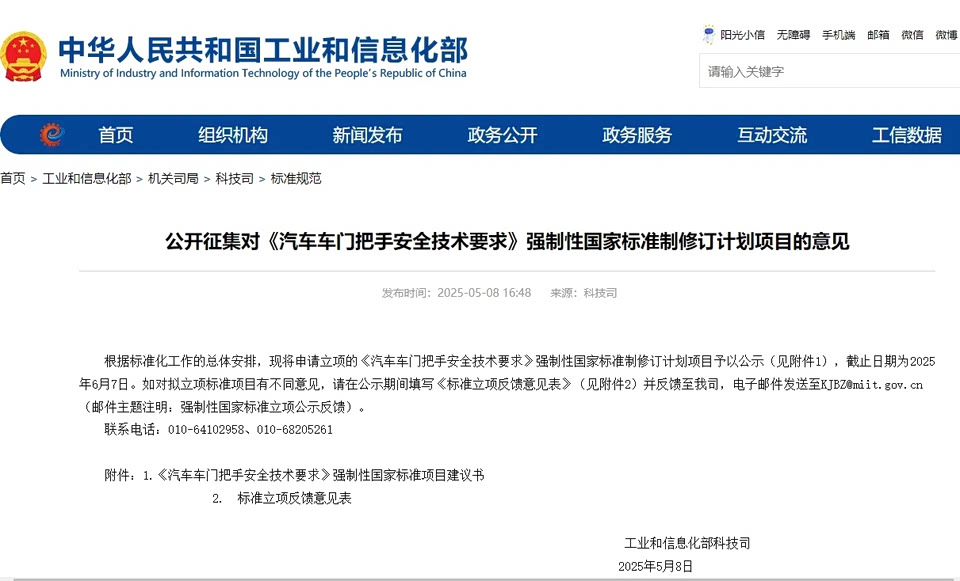 根据工信部官网内容,已经将申请立项的《汽车车门把手安全技术要求》强制性国家标准制修订计划项目予以公示,以后要增加“机械或者断电保护等安全冗余设计要求”,确保断电、碰撞等事故中车门系统能够开启。