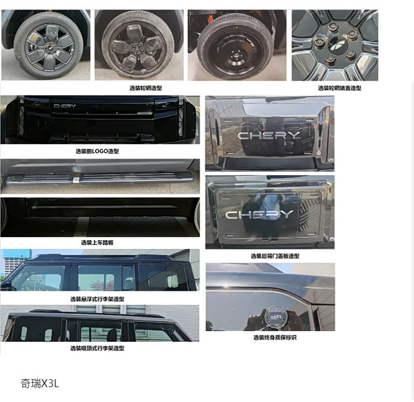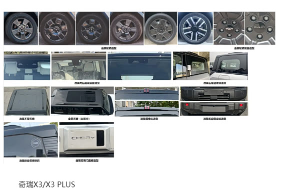 申报图显示,奇瑞三款新车均申报了大量的选装件供消费者选择,包括轮毂、前保险杠、行李架等。三款车型的车身尺寸也有所区别,奇瑞X3为4327/1910/1715mm,轴距2715mm;奇瑞X3 PLUS为4380(4433、4406)/1916(1910)/1741(1715)mm,轴距2715mm;奇瑞X3L为4545(4503)/1950/1815(1785)mm,轴距2783mm。