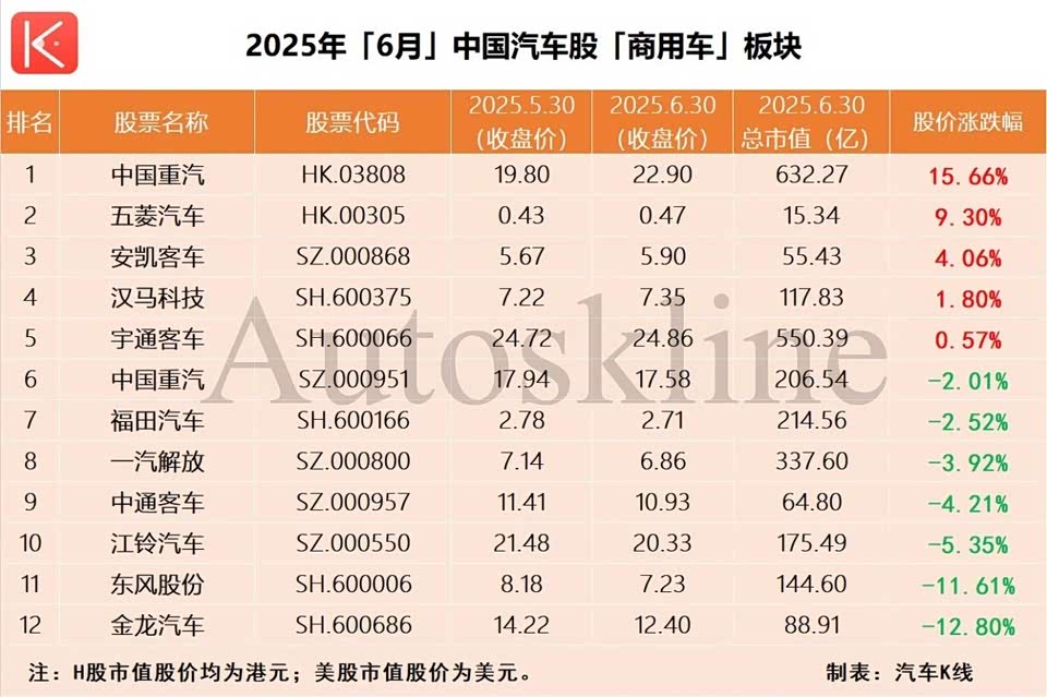 其中,东风集团股份或因叠加与长安汽车重组停摆影响,6月股价大跌20.69%,位列总榜跌幅第2位。