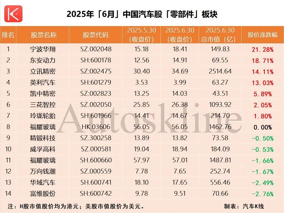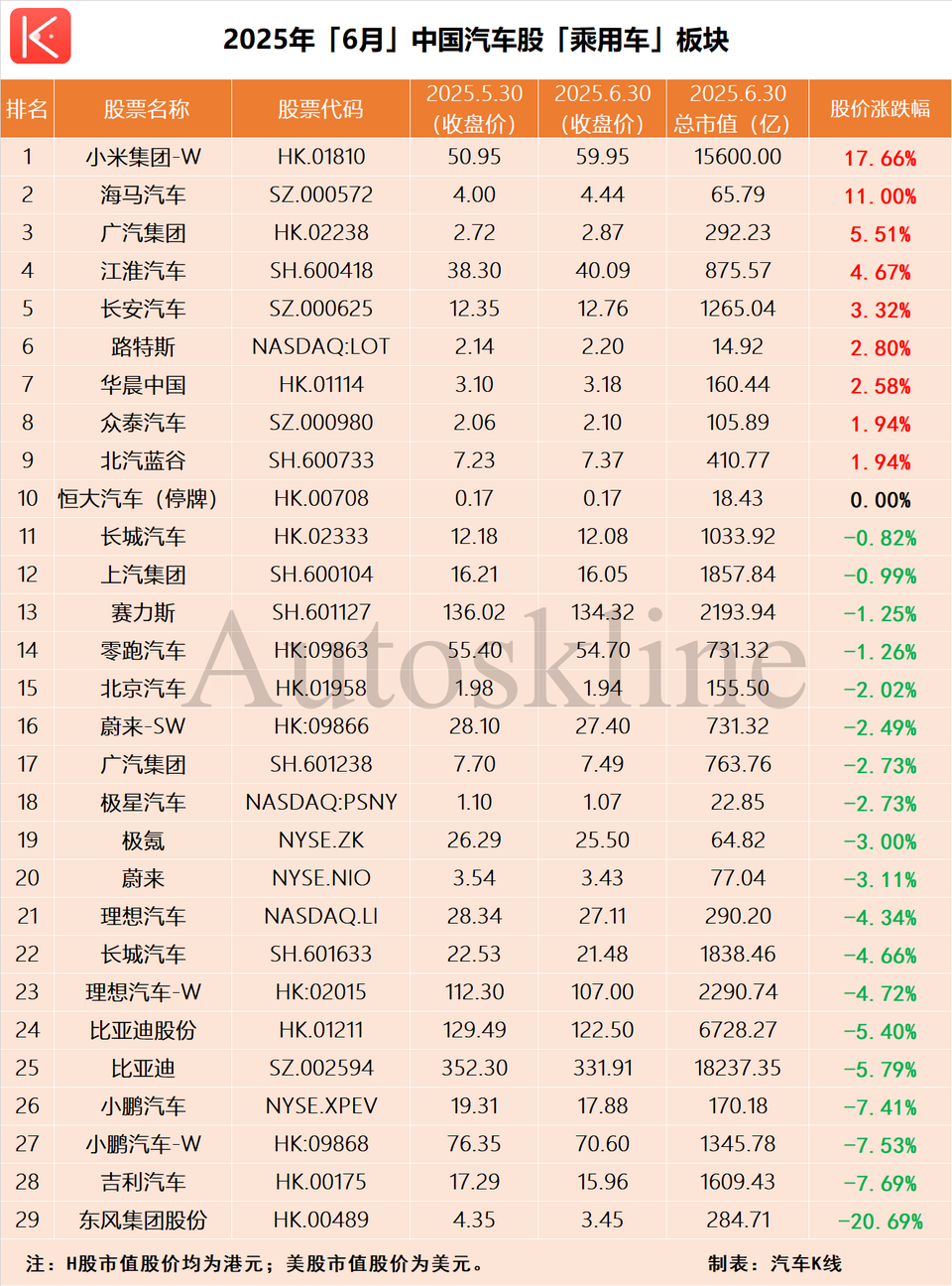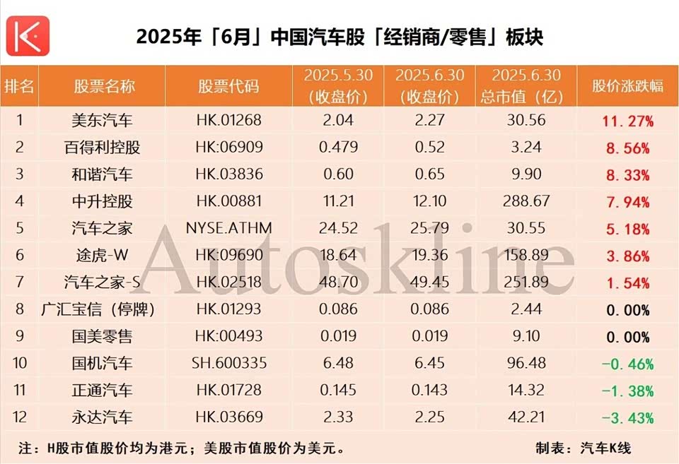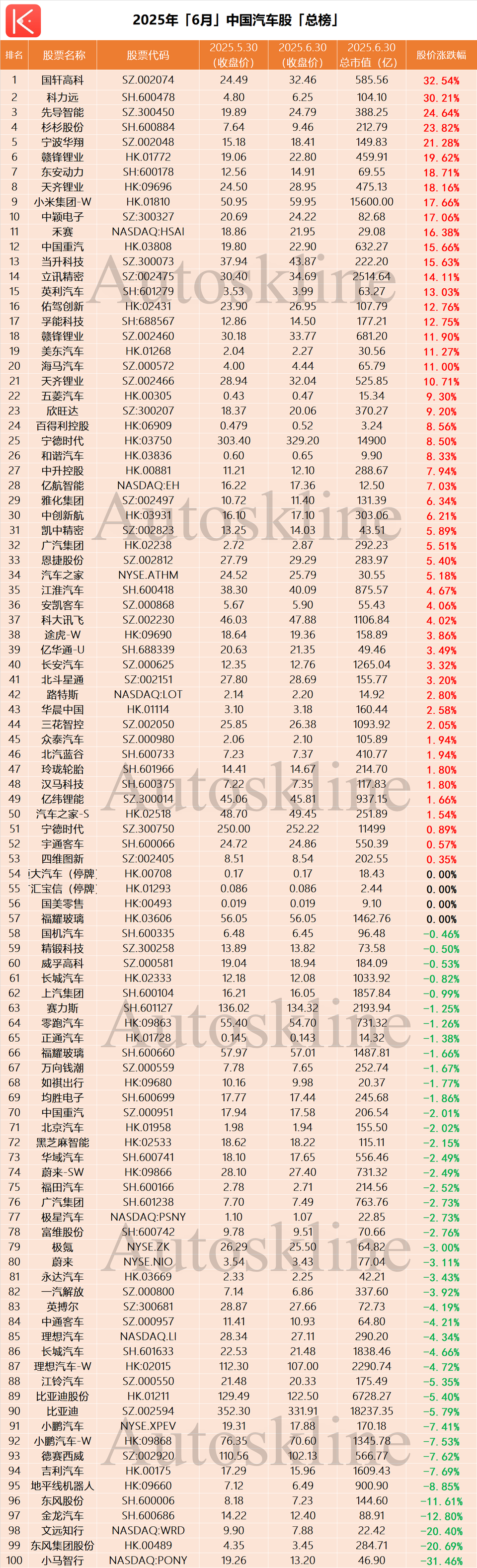 6月,《汽车K线》统计的100只中国汽车股过半飘红、平均股价上涨2.85%。