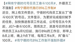 网传宁德时代施行896工作制。马云倡导的996福报已经落伍了,宁王的896开始大行其道。 重点是,外籍员工不强制。还真TM人性化