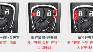 锁车:自动关闭车窗+天窗 降窗:开锁-关锁-开锁 天窗:锁车自动关闭。单独开启:开锁-关锁-开锁-关锁6秒内完成,独立打开天窗 以下操作每项操作,必须等待间隔20秒后再进行操作!