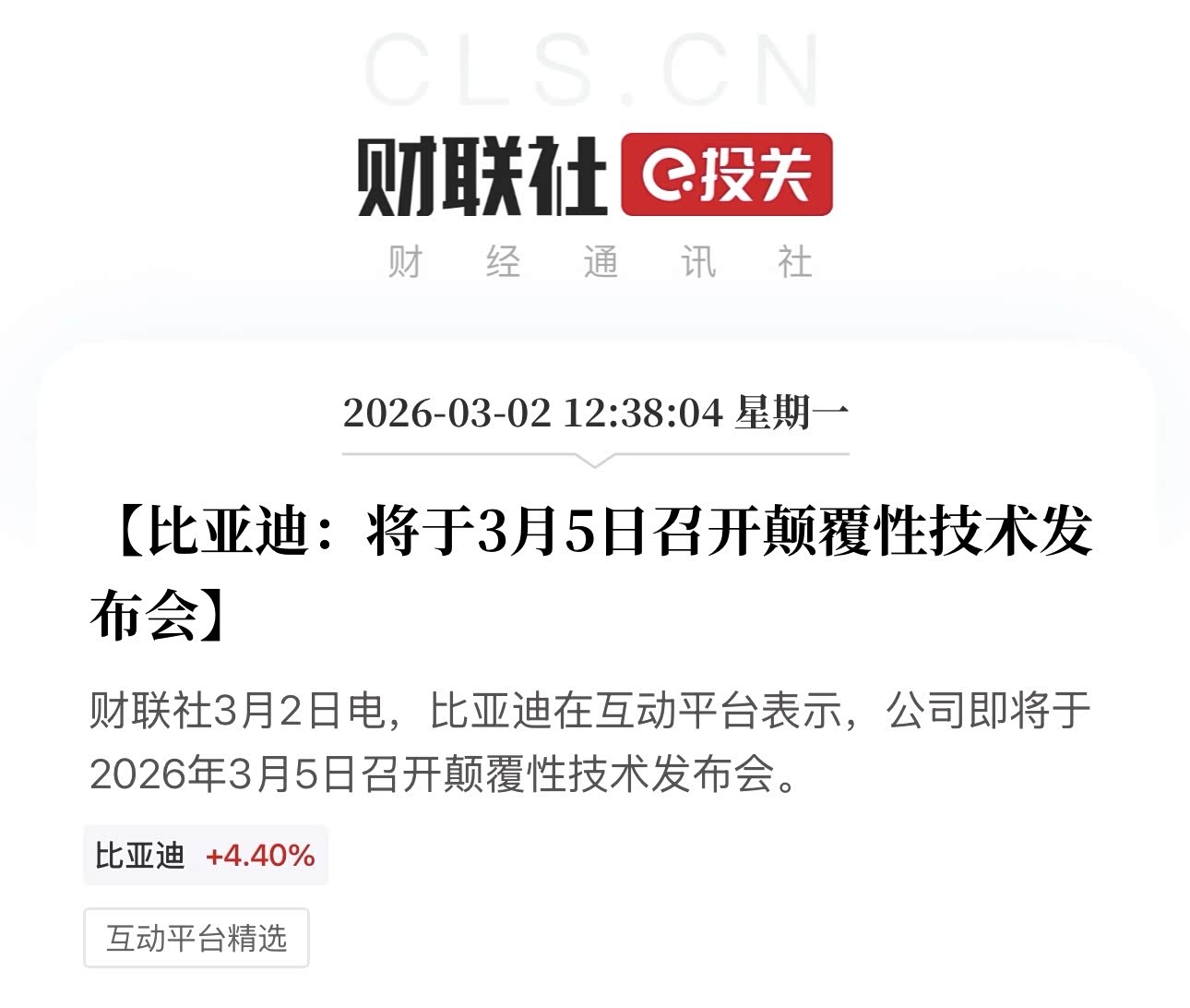 网传有多项新技术发布,例如更快的兆瓦闪充2.0,第六代DMI,还有更好用更智能的天神之眼5.0,还有新技术,比亚迪开年就要放大招了,选择3月5日这一天是惊蛰,要给大家惊喜。股票市场反应良好,大涨7%。过两天我要去深圳看看。#比亚迪股票大涨7%#
