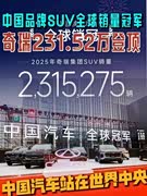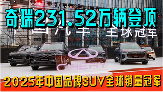奇瑞231.52万辆登顶2025年中国品牌SUV全球销量冠军