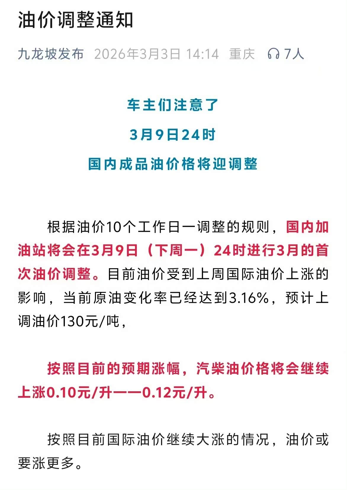 油价开始上调了,这两天赶紧去加油吧…… #油价或涨超70%#