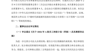 【宁德时代:拟推2026年A股员工持股计划】 宁德时代(300750.SZ)公告称,公司拟实施2026年A股员工持股计划,参与对象为公司中层管理人员及核心骨干人员,首次授予总人数4956人;持股规模不超过404.6802万股,占目前公司总股本的0.09%。本持股计划受让价格(含预留)为183.64元/股。