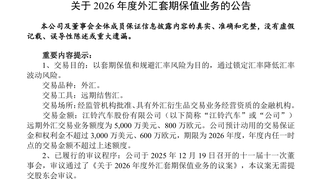 【江铃汽车:拟开展2026年外汇套期保值业务,额度5800万美元】 江铃汽车公告称,为套期保值、规避汇率风险,公司拟开展外汇套期保值业务,交易品种为外汇,交易工具为远期结售汇,交易场所为监管机构批准的金融机构。2026年远期外汇交易额度为5000万美元和800万欧元,预计使用交易保证金和权利金不超3000万美元和600万欧元。该业务已获董事会批准,无需提交股东大会审议。业务开展存在市场、流动性等风险,公司制定了相应控制措施。