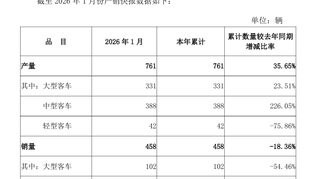 【安凯客车:2026年1月客车产量增35.65% 销量降18.36%】 安凯客车公告称,截至2026年1月,公司产量761辆,较去年同期增35.65%,其中大型、中型、轻型客车分别为331辆、388辆、42辆,同比变动23.51%、226.05%、-75.86%;销量458辆,同比降18.36%,其中大型、中型、轻型客车分别为102辆、296辆、60辆,同比变动-54.46%、116.06%、-70.00%。公告提醒,不能以产销数据直接推算业绩,最终数据以定期报告为准。