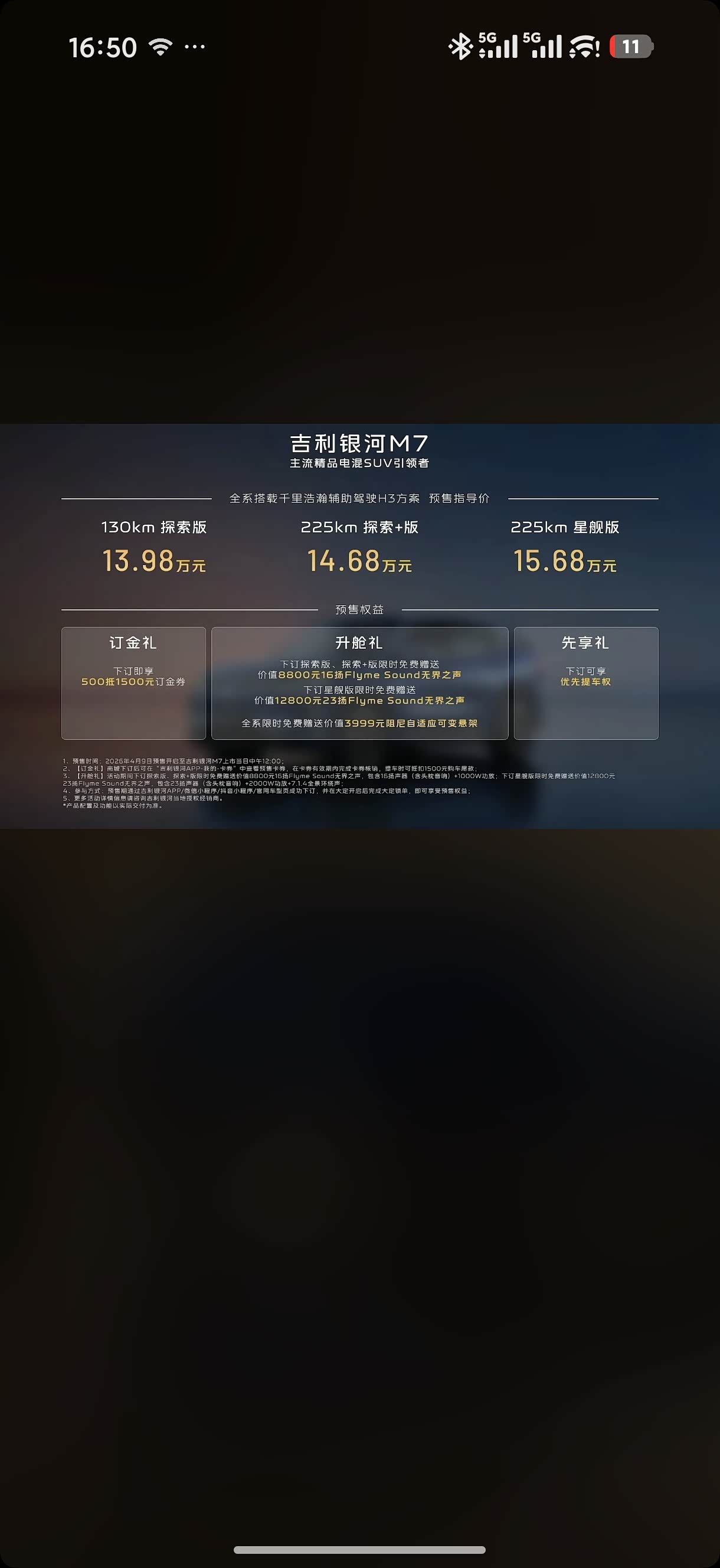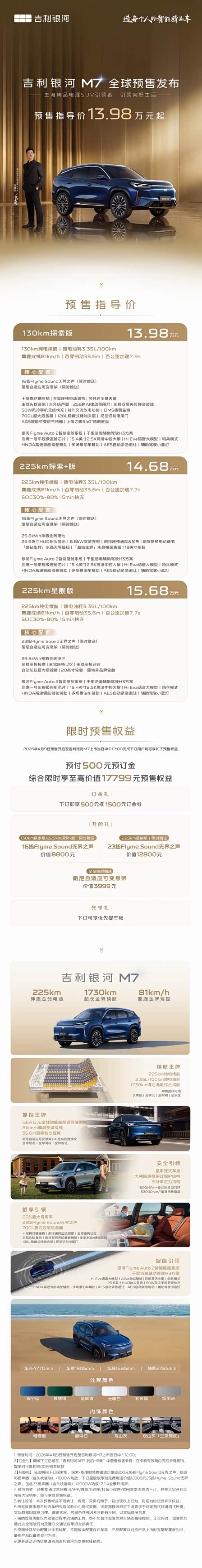 #任贤齐认证的SUV##主流精品电混SUV引领者#今天#吉利银河M7#正式全球预售~ 作为吉利银河开启两百万新征程首款新车、M系列首款主流电混SUV,这次银河M7直接拿硬核数据说话:225km纯电通勤可当纯电开,综合续航高达1730km,彻底告别里程焦虑。更离谱的是81km/h麋鹿测试成绩,比很多轿车还要稳定。 而杀手锏是首发的神盾金砖电池,130km+225km双纯电续航组合,也正式打响了2026年长续航争夺战。吉利是要倒逼整个主流电混市场重新洗牌~预售已开,想买插混的可以蹲住了!