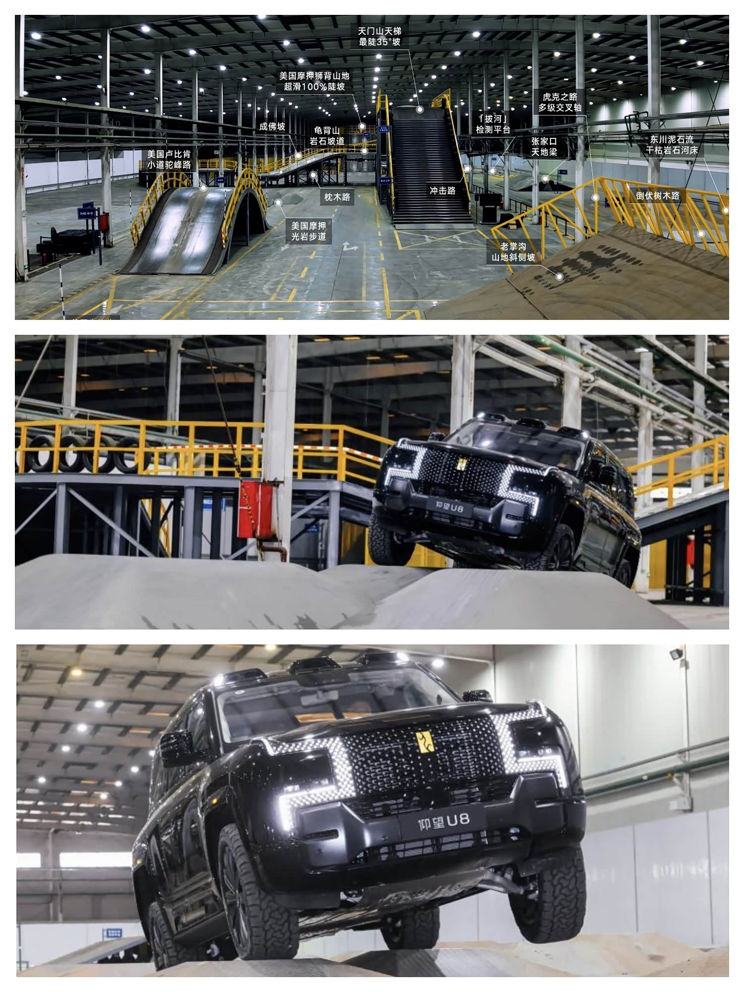 既然想要打造越野车,那肯定要有足够丰富的测试环境和技术,但在室内玩转极限越野,这个还是挺少见的。 看了一圈比亚迪综合越野开发中心,场地不错。有12000平方米专业场地、覆盖百余种极限地形与工。说这里是集研发、测试验证与量产落地于一体的测试场,主要验证比亚迪电驱越野的综合能力。 之前总是有人有各种的质疑声,这次应该就没得说了,因为我看这个场地把天门山天梯、45度可变坡道、卢比肯这些基本都复刻进来了,特别是那个天门山天梯,从视频里看都挺吓人的,坡度很陡。但2026款仰望U8却能轻松登顶并且还能倒着上,易四方、云辇-P+、eTCS 2.0全速域路面感知控制技术看来是真有用。 以前越野车都是油车,现在电车也能做到同样的事并且更加轻松,这也是技术进步的体现。#仰望U8倒爬天门山#