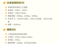 比亚迪两款新车申报,这颜值如何评价? 比亚迪海豹08 EV正式申报了,长宽高分别为5150mm,1999mm,1505mm;轴距3030mm。有单电机和双电机版本,单电机分别为255kw、320kw;双电机为190kw+320kw。 这款车是海洋网的旗舰车型,外观、尺寸、性能都没得说,技术也不用担心,现在就差一个上市时间了,估计在20万至30万价格区间。 腾势Z9S,车身尺寸为5090mm,1980mm,1490mm;轴距为3025mm。也是有三电机和单电机版本。三电机为270kw+310kw+310kw;单电机为370kw。 我看腾势Z9S争议蛮大的,主要是这个外观有些独特,和现款Z9系列不一样,但个人觉得还得看实车。而且,腾势Z9S不是走行政路线,走的是运动路线,估计会跑赛道刷圈的。这款车型用来拔高Z9系列的性能上限,其它的等上市后再看吧。