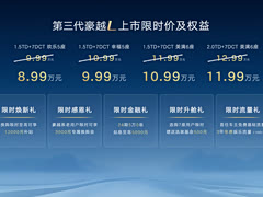 吉利第三代豪越L上市,售价9.99万元-12.99万元,限时优惠价8.99万元-11.99万元。1.5T车型最大功率133kW,峰值扭矩290N·m;2.0T车型最大功率160kW,峰值扭矩325N·m,全系均匹配7DCT变速箱。