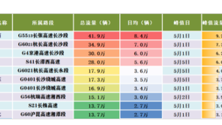"五一"期间收费站流量TOP10 “五一”期间,车流较大的收费站主要集中在环长沙周边高速公路收费站以及G60沪昆高速湘潭北收费站、G56杭瑞高速凤凰收费站、和S21长株高速株洲收费站,以长沙城东和城西两大出入口流量最为集中。"五一"期间全省门架流量TOP10 全省断面流量排名靠前的路段主要集中在G5517长常北线高速益阳段西往东方向、G6021杭长高速长沙段西往东方向,G4京港澳高速长沙段、湘潭段南往北方向,G5513长张高速长沙段西往东方向,G0401长沙绕城高速等,潮汐特征明显。