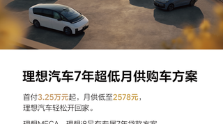 理想汽车7年超低月供购车方案来了! 2026年1月20日起购买理想汽车, 可享7年超低月供购车方案: 首付3.25万元起,月供低至2578元。 前几天还在说,感觉目前如果买车,我脑袋里就是乐道、蔚来和理想了,乐道L60合适我,但是吧,我喜欢前备箱他没有,L90太大了,我不喜欢~ 萤火虫很好,但后排真是太小了,不行,太憋屈~ 理想i6综合性还是能打,颜色也OK,座舱空间,功能俱全,很心动,但我还是喜欢换电~ 但我估计这辈子应该等不到理想和蔚来合作出换电款车型了~ 话说回来,这7年的超低月供购车,每月2578元,大家决定有诱惑力不?