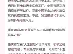 中国车企加速全球化布局,新能源车销量突破1500万辆,自动驾驶技术加速落地。 #汽车 #掌上汽车 中国车企全球化进入2.0阶段,瑞银预测2030年占全球份额三分之一 瑞银报告指出,中国车企凭借电动车技术优势和海外本土化扩张,2030年全球市场份额有望从目前的25%提升至33%。比亚迪在巴西扩建电动巴士底盘工厂、小鹏布局马来西亚生产等动作,显示中国车企从单纯出口转向供应链出海。不过,贸易壁垒和本地化合规仍是潜在风险。