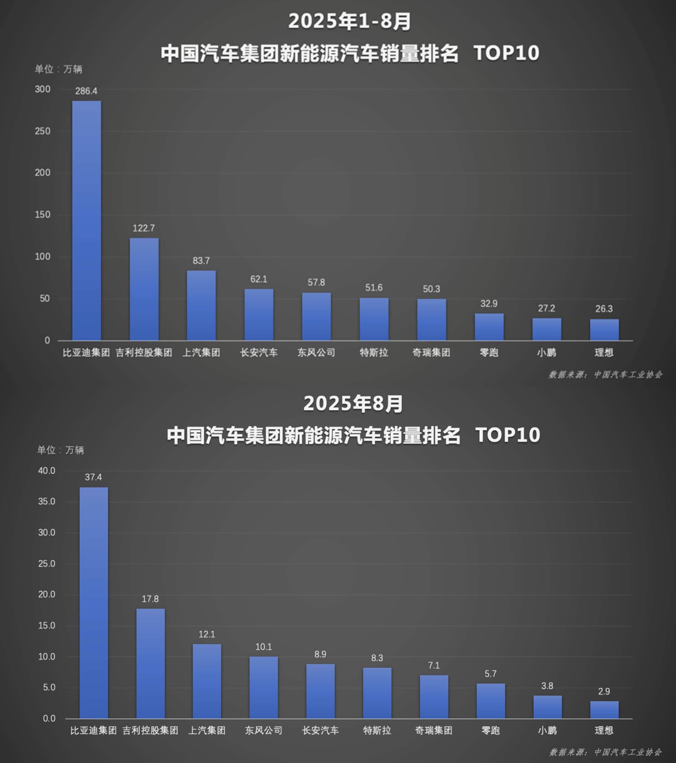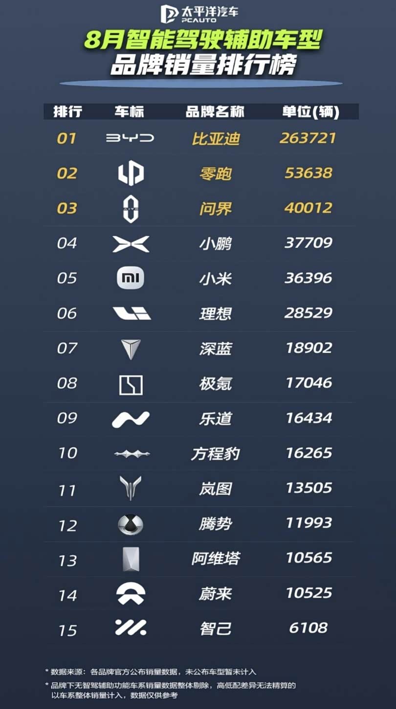 8月份智驾车型数据有意思,小米3.6万排第5,小鹏3.7排第4,问界4万排第3,零跑5.3万排第2,而第一名达到了26.3万辆,足足第二名的5倍之多,是第2~第10之和,这个品牌就是比亚迪。 更有意思的是,比亚迪王朝海洋8月总销量是34.3万辆,接近80%车型都是智驾车型。 第三个数据是,25年1~8月,比亚迪销售新能源汽车286.4万辆,是第二名吉利控股的2倍多,同比增长23%,平均增速还在加快,比亚迪已完成年度目标62%,销量实现多维领跑。 以上数据毫无疑问的指向一个结论:技术为王才是护城河!近年来,比亚迪“技术护城河”持续拓宽。年初发布的“天神之眼”辅助驾驶系统,搭载车型累计销量已超140万辆,每天生成的辅助驾驶数据里程超8700万公里。灵鸢车载无人机系统、首创兆瓦闪充技术的超级e平台等创新成果相继落地,这都是其他车企难以比拟的优势,也是消费者选择比亚迪的原因之一!