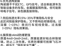 选车膜15条铁律 1.前挡透光率死守70%红线 法规规定前挡风玻璃可见光透射比不得低于70%,低于此值年检不通过且存在行车安全隐患。实测发现,原车玻璃透光率约75%时,需选择透光率93%以上的膜才能合规。