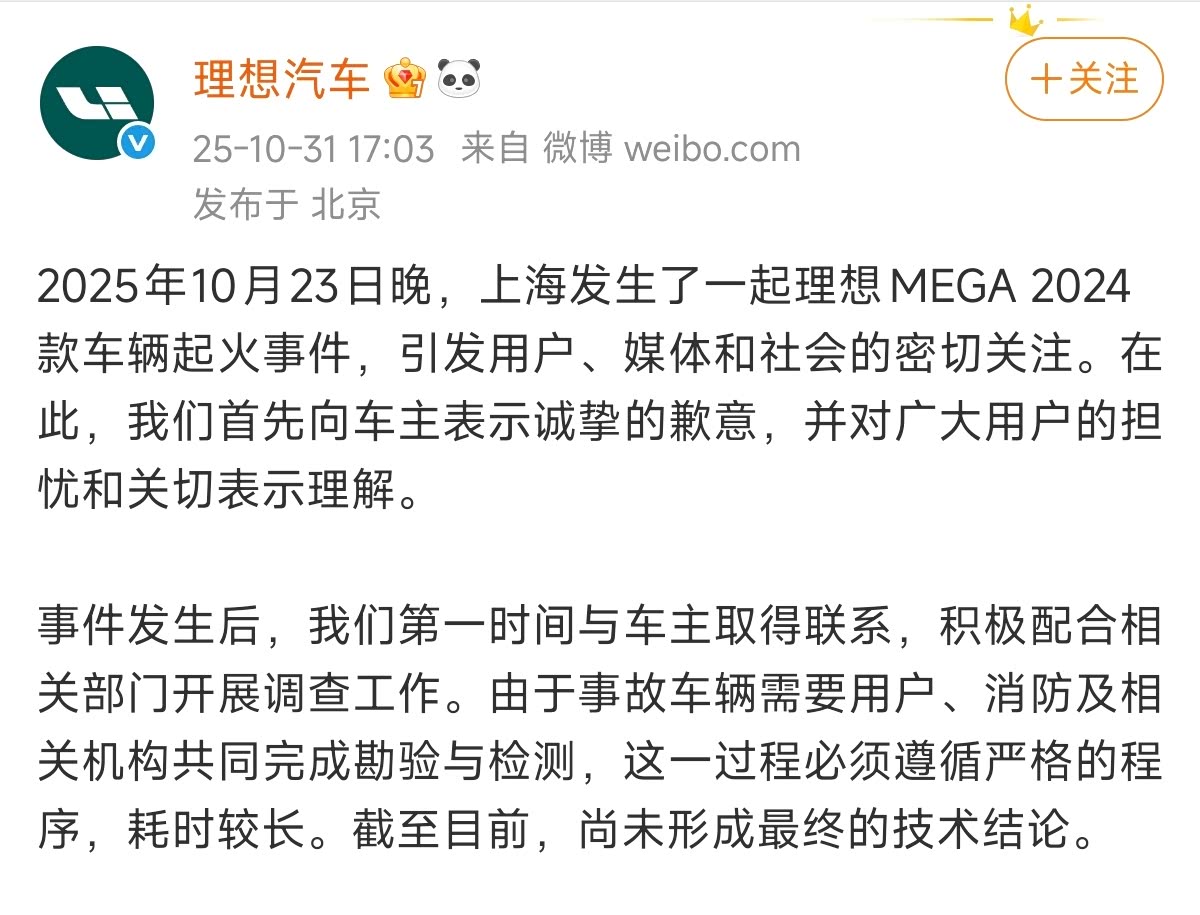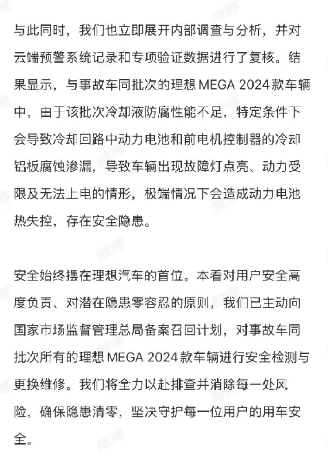 理想汽车最新公告,两个事: ①上海起火的理想MEGA 2024款,具体原因还未有定论。 ②针对生产日期从2024年2月18日至2024年12月27日的2024款理想MEGA 进行召回处理,更换全新动力电池及相关配套设备。 该批次召回车型冷却液防腐性能不足,在特定条件下,可能存在冷却回路中动力电池和前电机控制器的冷却铝板腐蚀渗透。导致车辆故障灯点亮、动力受限及无法上电的情形,极端情况下会造成动力电池热失控,存在安全隐患。