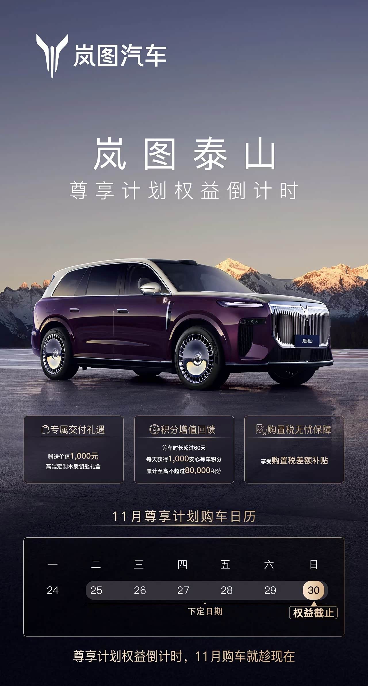 最后5️⃣天!岚图泰山尊享计划权益倒计时! 三重福利,抓紧上车👇 ✅价值1000元高端定制木质钥匙礼盒 ✅超时等车至高80,000积分回馈 ✅享受购置税差额补贴,买车无忧 #岚图泰山 #华系首搭三腔空悬旗舰SUV