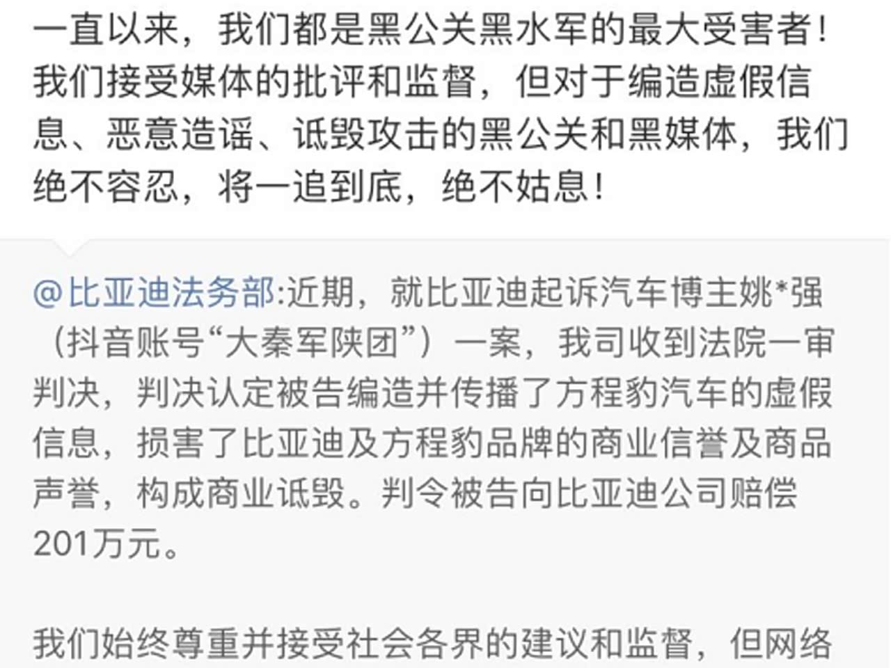 “姚十八”侵权比亚迪方程豹案判决,支付赔偿款等共计201万元