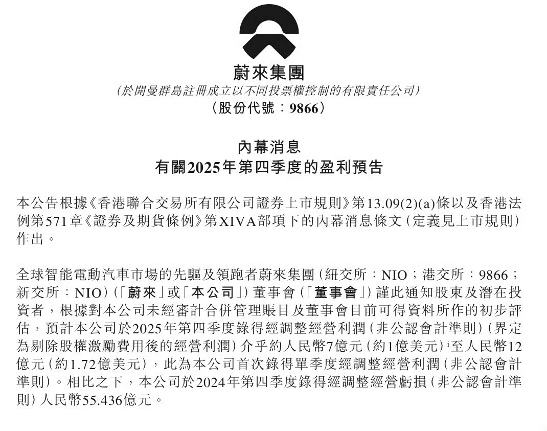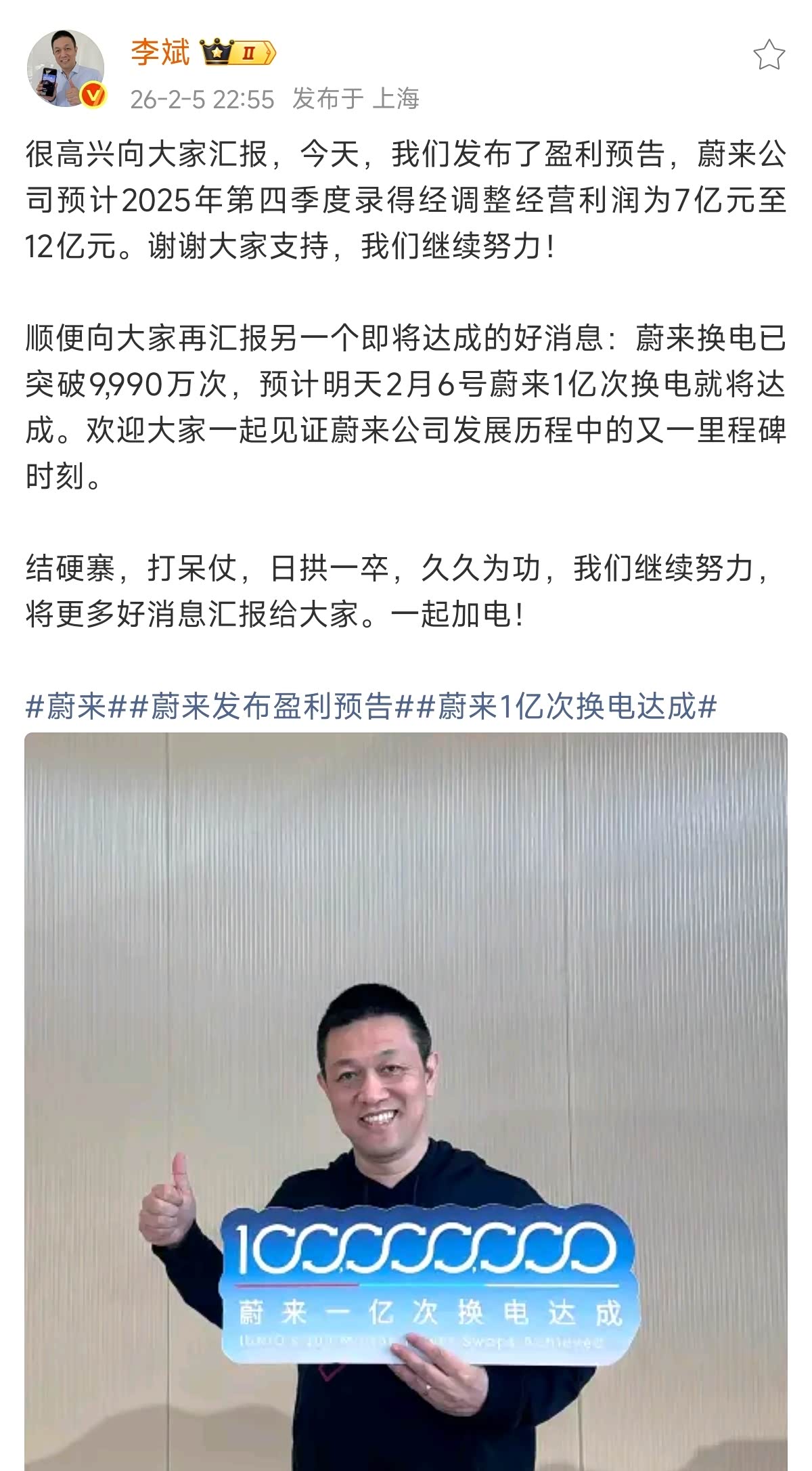 蔚来发布2025年第四季度盈利预告: 预计公司2025年第四季度录得经调整经营利润(非公认会计准则),介于7-12亿元人民币之间。 这是蔚来11年第一次单季度经调整经营利。 这个盈利实际上是剔除股权激励费用之后的经营利润。