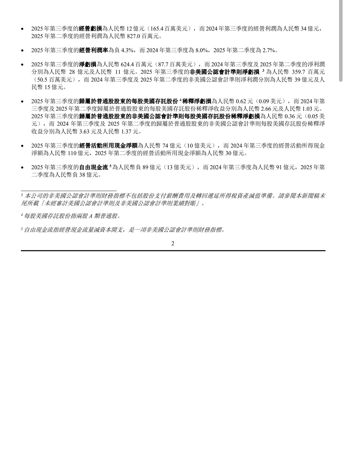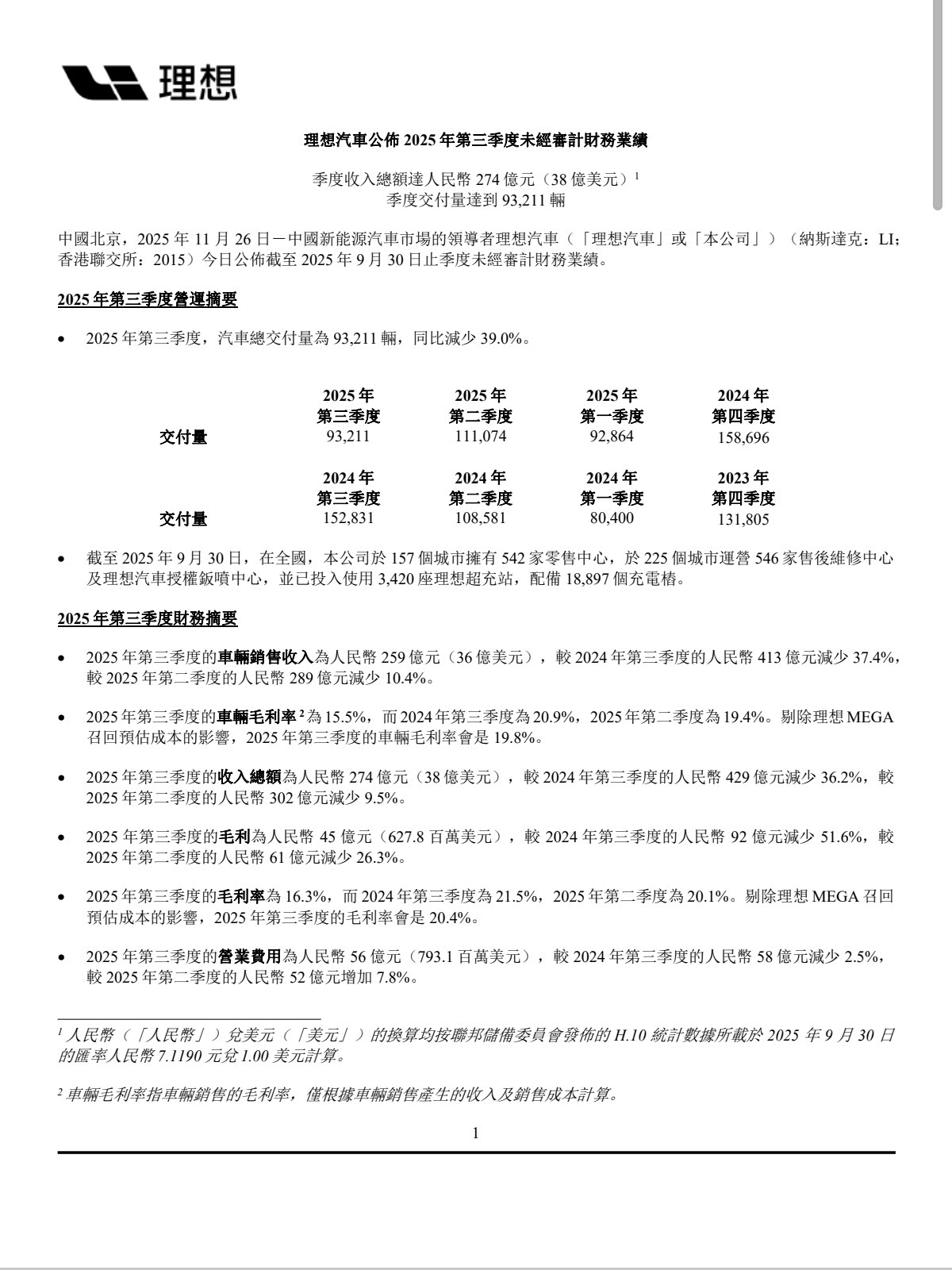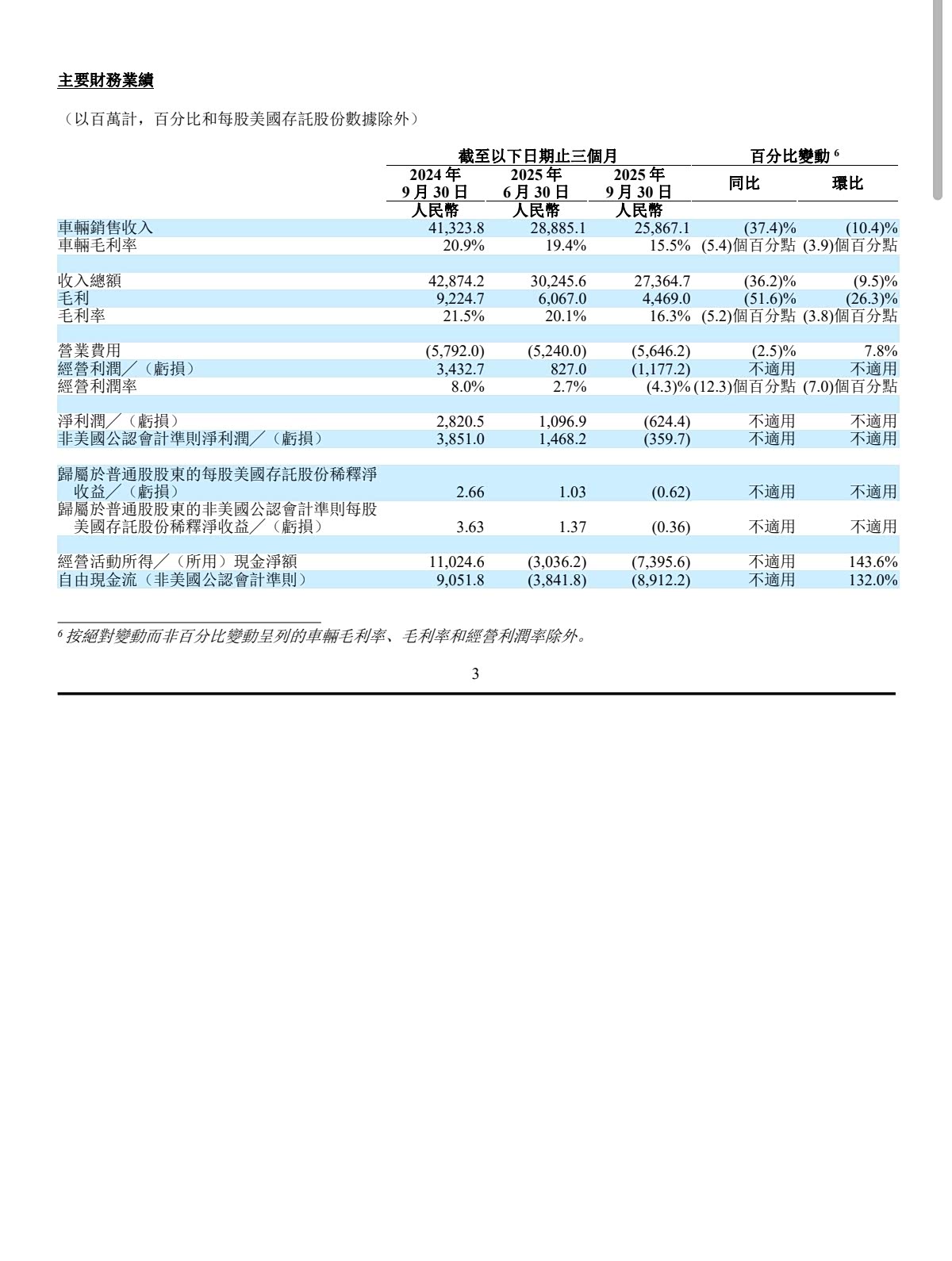 从理想汽车2025年第三季度财报数据来看,呈现“收入下滑、利润转亏、现金流不佳”的趋势。 -整车销售收入258.67亿元,同比下降37.4%,环比下降10.4%; -收入总额273.65亿元,同比下降36.2%、环比下降9.5%; -车辆毛利率从2024Q3的20.9%降至15.5%,环比二季度的19.4%,也降了3.9个百分点。整体毛利率也降至16.3%; -经营利润从2024Q3的盈利34.33亿元、2025Q2的盈利8.27亿元,转为亏损11.77亿元; -净利润亏损6.24亿元; -经营活动现金流从2024Q3的净流入110.25亿元,转为2025Q3净流出73.96亿元; -自由现金流也转为净流出89.12亿元,环比2025Q2的净流出38.42亿元,压力放大。 整体来看,理想汽车第三季度的核心经营指标全面走弱。尽管单车售价有小幅度上涨,但是毛利率和销量的下滑对整体表现影响还是很明显的。 四季度展望: -整车交付10-11万台,同比减少30.7-37%; -收入总额265-292亿元,同比减少34.2-40.1%