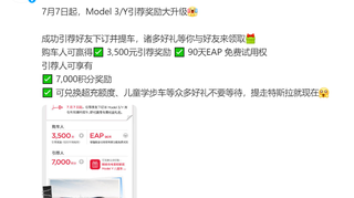 特斯拉官方微博今日宣布,7月7日起升级Model 3/Y引荐奖励。成功引荐好友下订并提车,购车人可获得3500元引荐奖励及90天EAP免费试用权,引荐人可享7000积分奖励、可兑换超充额度、儿童学步车等。 骄傲的特斯拉都开始使用老客户转介绍了,充分使用品牌的私域流量。接地气会玩哦!