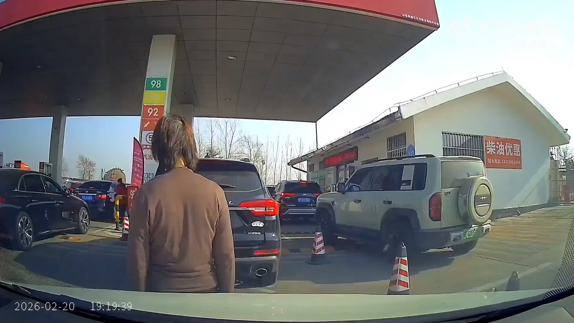 女子在加油站人肉插队躺后车引擎盖