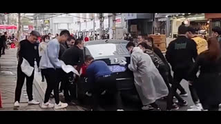 车子掉不过头,大伙一起把车抬过来!