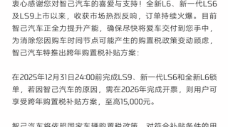 #智己汽车# 也给出了自家的跨年购置税补贴方案:今年年内完成锁单的LS9、新LS6和新L6买家,如果因为智己汽车的原因而需要在2026年开票,则可以享受至多1.5万元的跨年购置税补贴。#新能源汽车# #汽车资讯#