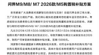 问界也放出了自家的购置税补贴方案:M9、M8、M5和2026款M7四款车型的买家在本月内完成锁单,如果遇到非用户原因导致的交付延迟,则可以享受跨年购置税补贴方案,1.5万封顶。 毕竟是年底了,厂商保销量/促锁单+用户寻求一个能安心的保障,这波是各取所需😎 #新能源汽车# #新能源汽车#