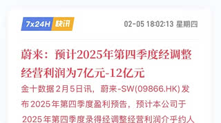 蔚来终于实现季度盈利了😇金十数据快讯,蔚来预估2025年第四季度经调整经营利润为7亿~12亿元人民币,这应该是头一遭。#蔚来# #汽车资讯#