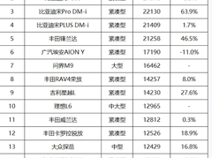5月SUV销量排行中,销量超过2万辆的有5款,1万辆以上的有22款,其中Model Y排名榜一,元Plus第二,宋Pro DM-i排名第三,锋兰达排名第五,成为销量最好的燃油SUV车型,M9排名第七,成为销量最好的大型SUV,理想L6排名第十,成为销量最好的中大型SUV,前十名中只有3款燃油车。 部分合资车型销量也有所下滑,探岳排名第13,成为销量最好的燃油中型SUV,CR-V排名17,奥迪Q5L排名18,宝马X5排名32,而作为曾经的销量冠军哈弗H6,销量还不到1万台,排名27, 领克06、昂科威、瑞虎9、小鹏G6、捷途X90、探索06、传祺GS3均在3~4千辆之间,奇骏、途胜、马自达CX-5、航海家都只有2千多辆,表现都很一般。