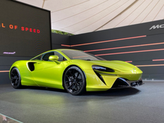 在刚刚开幕的古德伍德速度节上,迈凯伦全新混动超跑Artura实车正式亮相。据悉,新车是轻量化碳纤维架构(MCLA)打造的首款车型。新车在此前就已经接受预定,并且将于今年第四季度交付。 迈凯伦Artura的外观采用了家族化的设计,它的前脸没有什么特别之处,新车的前脸采用了一个突出的上唇设计,前脸的下方采用了非常有性能感的黑色包围,两端采用了三角形的进气设计。新车的大灯很个性化,采用了椭圆形的设计,部分灯体采用了内凹设计。新车的大灯下方采用了一个细长的椭圆形空气导流槽,风格非常凌厉。迈凯伦Artura的内饰采用了家族化的设计,新车的座舱很有战斗感,它采用了一体式的桶椅设计,座椅的包裹感很不错。新车采用的是三幅式平底的方向盘,它的中控大屏采用了很立体的设计。动力系统部分,迈凯伦Artura搭载由3.0L双涡轮增压V6发动机与电动机及电池组所组成的插电混合动力系统,综合最大输出功率500kW(680马力),峰值扭矩720Nm。