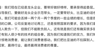 什么叫格局?比亚迪的表现就是,见过比亚迪对行业指点江山吗?见过比亚迪冷嘲热讽友商吗? 比亚迪王传福:我们现在已经是龙头企业,要带好做好榜样,要承受得起委屈。 国家也多次教导我们,要做好龙头企业示范带头,一定要带好头,比亚迪的话也是践行国家对我们的教导。 我们可能会丢掉一两个月一两个季度的一些业绩的增长,但是我们换回来的是比亚迪长期的口碑。 公司反复地讨论再三,还是按照国家的要求,因为我们是龙头老大,我们可以被别人欺负一下,但我们不能欺负别人。 还有就是我们还有确实很多别人没有的技术的沉淀,还有别人很少有的技术的组合拳。因为我们知道我们的实力,我们知道我们要有更高的技术来惊艳消费者,能让我们消费者感动。 我们把比亚迪的不拉踩别人,成为行业的榜样,赢得国家,赢得行业,最终赢得消费者的尊重