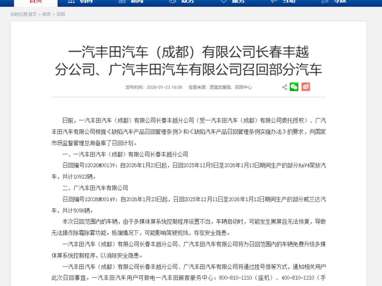 可能发生黑屏且无法恢复,丰田召回部分RAV4荣放、部分威兰达