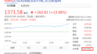 7月6日,特斯拉股价收盘大涨13.48%,报1371.58美元,再创历史新高,当天特斯拉股票市值上涨了300亿美元,使总市值达2543.94亿美元,进一步巩固了其作为全球最具价值汽车制造商的地位。自特斯拉公布第二季度交付量超乎预期以来,最近五个交易日其股价上涨已逾40%。
