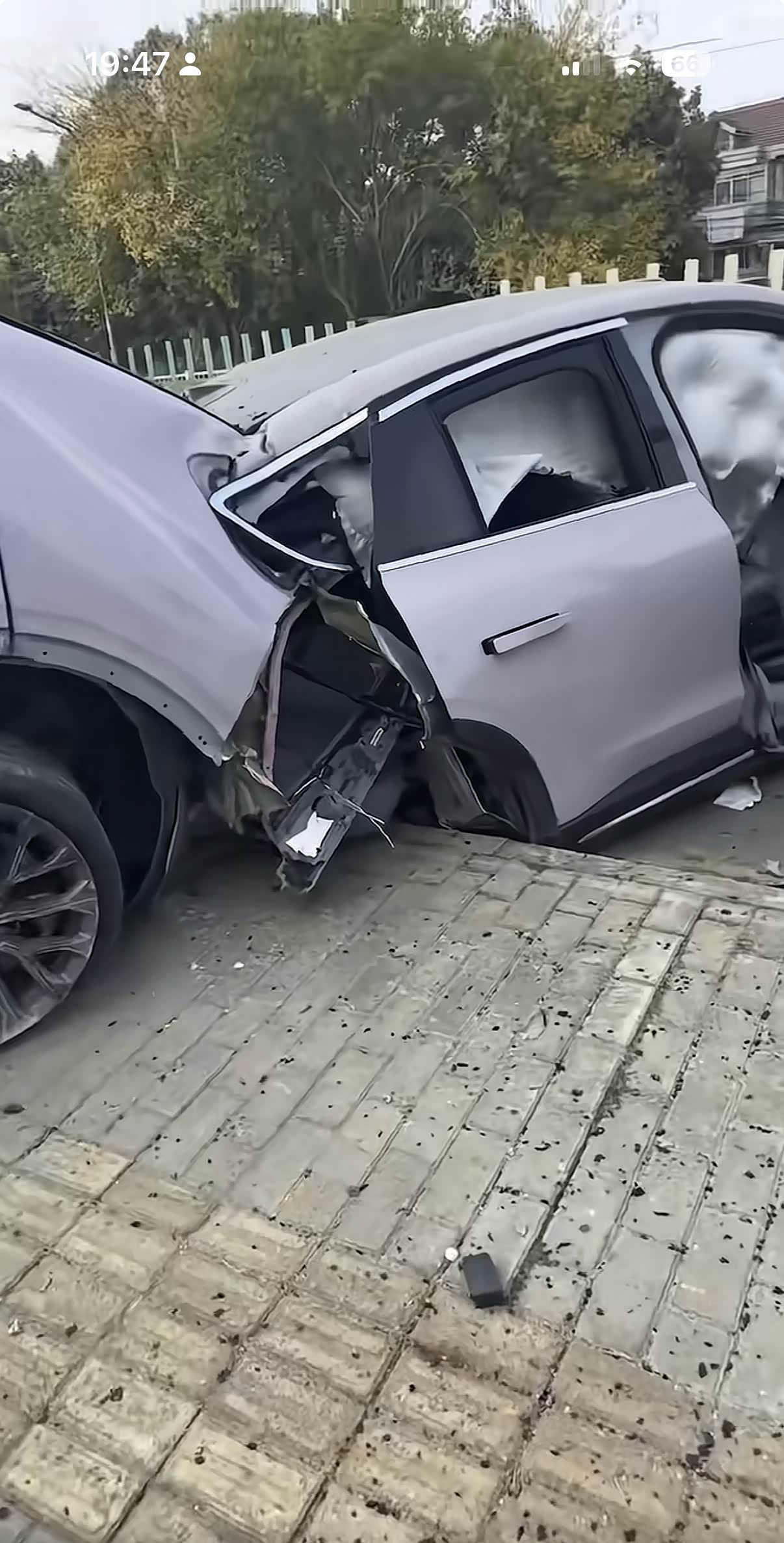 断成两截,车门自动解锁、安全气囊正常弹开、电池没燃、人也没事(惊吓除外),还是可以了。