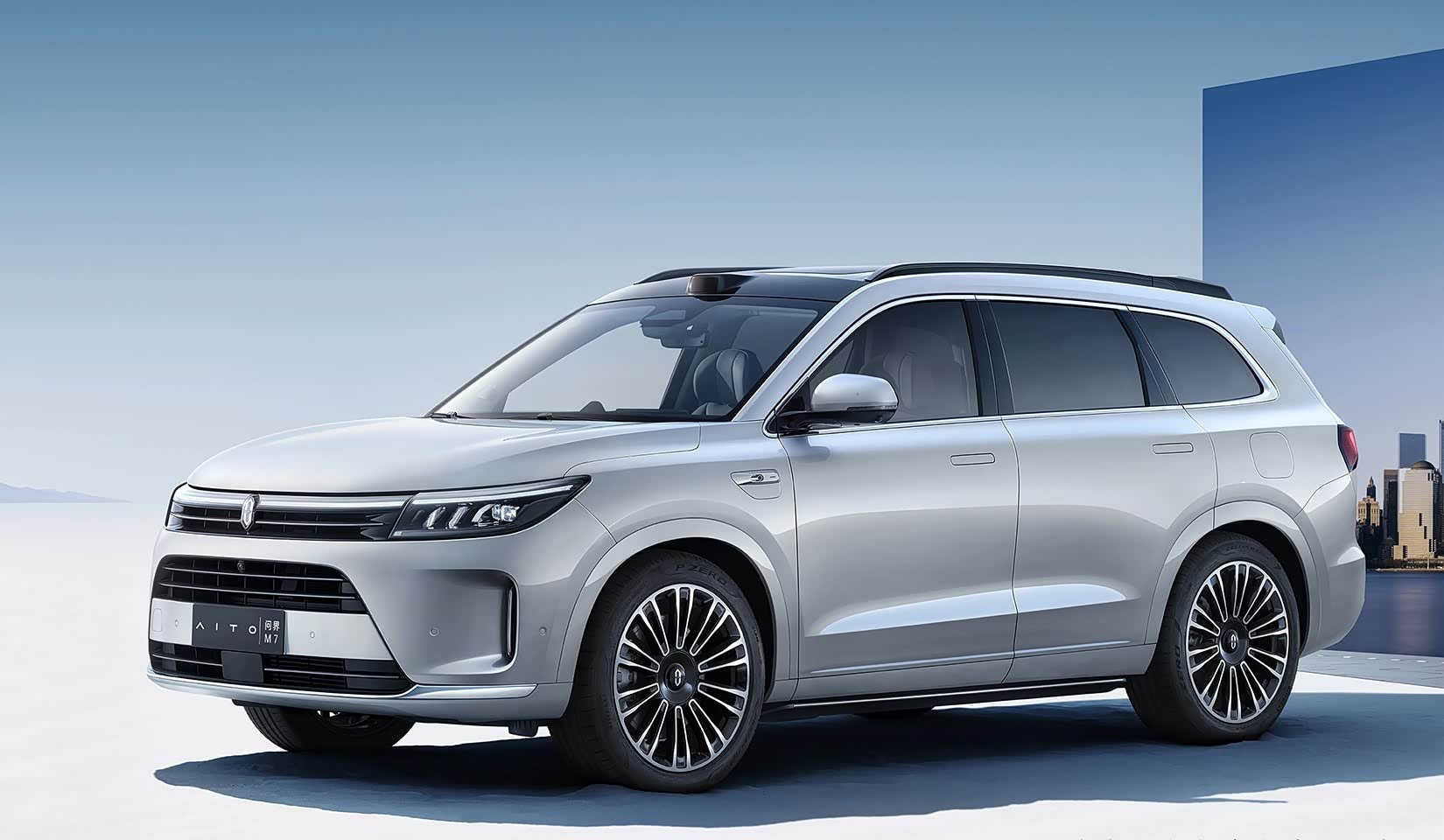 #新车上市 #9月12日,AITO问界新M7系列正式上市。共推出五款车型,价格区间为 24.98-32.98 万元。作为改款,新款问界 M7 增加五座版本选择,搭载华为 ADS 2.0 智驾系统等配置。外观方面,新款问界 M7 前脸部分采用上下双格栅的设计,上方格栅为窄条幅倒梯形并与两侧大灯组相连,而下方为大尺寸的梯形设计,上下格栅内部均带有镀铬饰条点缀。此外,其连接左右大灯组车头的贯穿灯带也可以点亮。车身尺寸方面,新车长宽高分别为 5020*1945*1760mm,轴距为 2820mm。内饰部分采用简洁明快的风格,采用环抱式座舱设计,搭配 10.25 英寸曲面全液晶仪表 +15.6 英寸 2K HDR 中控屏。配置方面提供鸿蒙智能座舱 3.0,而智驾版将独有 HUAWEI ADS 2.0 高阶智能驾驶系统,配备 1 个顶置激光雷达、3 个毫米波雷达、11 个高清视觉感知摄像头及 12 个超声波雷达等 27 枚传感器等。动力方面采用 HUAWEI DriveONE 增程电驱平台,搭载 1.5T 增程式混动系统并提供两驱和四驱版本,其中四驱版 0-100km/h 加速 4.8 秒,CLTC 工况满油满电综合续航 1300 公里、纯电续航 240 公里,馈电工况下百公里油耗 5.6L。参考现款数据来看,两驱版最大功率为 200kW,四驱版综合最大功率为 330 马力。
