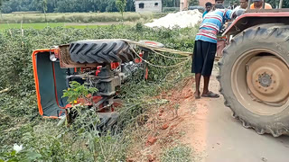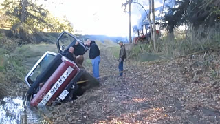 新手开拖拉机不小心侧翻,司机吓坏了,看村民怎么给拽上岸的